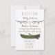 Una tarjeta de recepción de boda rústica que presenta una ilustración de ramas de siempre verde. Canoa verde en la parte inferior.
