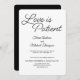 Invitación de recepción de boda elegante, chic, moderna, en color blanco y negro. Este diseño presenta una tipografía moderna para las palabras "Love is patient". Personalice este anuncio de boda que también sirve como invitación de recepción de boda con los nombres de la novia y el novio y todos los detalles de la fiesta sobre el intercambio de votos y la boda. Este diseño de layout moderno y elegante es fácil de personalizar.