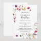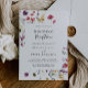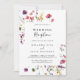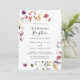 Esta invitación de recepción de boda clásica con flores silvestres coloridas es perfecta para una fiesta moderna después de una fuga. El diseño presenta flores silvestres amarillas, moradas y blancas con follaje en un fondo de acuarela rosa y verde.