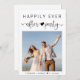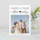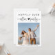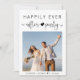 Anuncio de fuga o matrimonio moderno e invitación a la recepción de boda. La parte delantera presenta la foto de su boda y "Fiesta Felices para Siempre" en una mezcla de tipografía simple y un guión elegante con un corazón y florituras. Debajo de su foto, agregue sus nombres y la fecha de la boda. En el reverso, agregue los detalles de la fiesta o recepción y sus nombres en un guión similar a una firma.