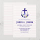 Ancla náutica y monograma enmarcados por una versión iluminada de flores patrióticas: rosa blanca, peonía rosa sonrosado y azul claro. Rayas preppy rosadas y blancas para un evento de boda de verano, playa o destino.