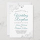 Estas hermosas invitaciones de boda están diseñadas para los invitados que solo están invitados a la recepción, pero no a la ceremonia real. Presentan un diseño simple pero elegante con volantes de encaje de lámina plateada falsa sobre un fondo blanco. El texto alterna entre gris y turquesa con un dorso de color aqua oscuro jaspeado.