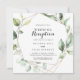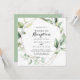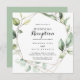 Esta invitación de recepción de boda elegante geométrica dorada con vegetación es perfecta para una fiesta sencilla después de una fuga. El diseño cuenta con hojas de eucalipto verde botánico pintadas a mano, adornando un marco geométrico dorado.