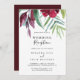 Esta invitación de recepción de boda floral tropical caligráfica es perfecta para una fiesta rústica después de una fuga. Este encantador diseño pintado a mano presenta preciosas flores de color burgundy, púrpura y follaje verde ordenadamente dispuestos en ramos elegantes.