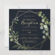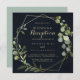 Esta invitación de recepción de boda geométrica dorada azul verde es perfecta para una fiesta simple después de una fuga. El diseño presenta hermosas hojas verdes pintadas a mano en un fondo azul oscuro, adornando un marco geométrico dorado.