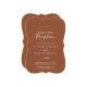 Esta invitación minimalista de recepción de boda con hojas de terracota es perfecta para una fiesta bohemia después de una fuga. El diseño presenta una simple silueta de hoja de follaje en un naranja quemado terroso con un estilo desértico bohemio minimalista. Las tarjetas de RSVP se venden por separado, o puede agregar la información de RSVP en el reverso de la tarjeta.