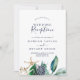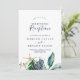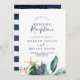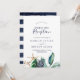 Esta invitación de recepción de boda moderna náutica con verde es perfecta para una fiesta de post-elopamiento en la playa. El diseño botánico presenta hermosas hojas verdes con flores de color azul marino y acentos de estrellas de mar doradas, lo que le da un ambiente playero. Las tarjetas de RSVP se venden por separado, o puede agregar información de RSVP al dorso de la tarjeta.
