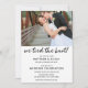 Anuncia a tus amigos y familiares que te has casado. Y luego invítalos a la celebración de tu recepción de boda. "¡nos atamos!" en escritura moderna. Personaliza con tu foto e información detallada para una celebración post-boda