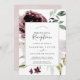 Esta florida invitación romántica a la boda es perfecta para un elegante fiesta post-salida. El moderno diseño rústico de boho cuenta con románticas flores acuáticas en tonos suaves de burdeos, malva, rosa y crema blanca con hojas verdes. Las tarjetas RSVP se venden por separado, o puedes agregar información RSVP a la parte posterior de la tarjeta.