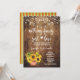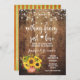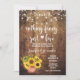 La plantilla de recepción de boda rústica de girasoles dice "nada elegante, solo amor", y cuenta con fondo de madera rústica, una cesta con girasoles, luces de cuerda y parte posterior coincidente. Para acceder a herramientas de edición avanzadas, vaya a “Personalizar” y luego al enlace "haga clic para personalizar aún más"