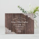 La invitación de recepción de boda con encaje rústico y madera oscura funciona para todas las estaciones y es perfecta para la pareja que tuvo una ceremonia privada y desea celebrarla con familiares y amigos. Totalmente personalizable y parte de una colección (ver enlace directamente debajo de la imagen principal).