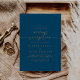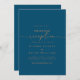 Esta invitación a una boda clásica de oro azul marino es perfecta para un fiesta post-salida moderno. El diseño, sencillo y elegante, presenta moda y una tipografía de escritura sofisticada en oro quemado. Las tarjetas RSVP se venden por separado, o puede ver los detalles de RSVP en la parte posterior o inferior de la tarjeta.