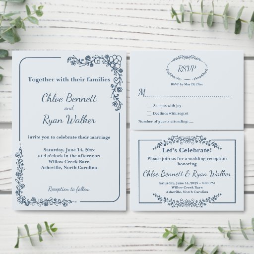 Invite a los huéspedes a celebrar su matrimonio con esta invitación monocroma rústica de la recepción. Diseñada con delicados acentos florales y elegantes tipos de letra, esta tarjeta intemporal es perfecta para recepciones de granero, campo o jardín. La paleta de un solo color mínimo (disponible en azul polvoriento, verde sabio o taupe cálido) añade un toque romántico y simple. Personalice con sus nombres, fecha, hora y ubicación para una hermosa tarjeta de celebración de la recepción.