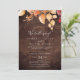 Esta tarjeta de recepción de elopamiento de madera marrón rústica de hojas de otoño es perfecta para una fiesta post elopamiento de octubre. El diseño rústico campestre presenta impresionantes hojas de otoño pintadas a mano en acuarela en tonos de puesta de sol de amarillo, naranja quemado y rojo borgoña que resaltan en un fondo de madera falsa. Las tarjetas de RSVP se venden por separado.