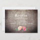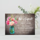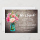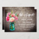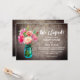 Esta tarjeta de invitación de recepción de elopamiento en frasco de mason rústico con flores es perfecta para una boda con tema floral campestre. El diseño presenta un arreglo elegante de peonías y flores silvestres de color rosa claro en acuarela en un frasco de mason azul sobre un fondo texturizado de madera. Las tarjetas de RSVP se venden por separado.