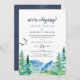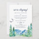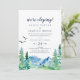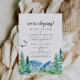Esta tarjeta de recepción para elopement Rocky Mountain es perfecta para un fiesta de postergación al aire libre. El diseño presenta un paisaje natural pintado de azul y verde con pinos acuarelas, pájaros y montañas. Las tarjetas RSVP se venden por separado.