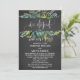 Esta tarjeta de recepción de elopement de "nos escapamos" con follaje en pizarra es perfecta para una fiesta post elopement rústica. El diseño presenta un marco de hojas verdes y elementos botánicos de follaje en un fondo de pizarra gris carbón. Las tarjetas de respuesta a la RSVP se venden por separado.