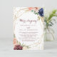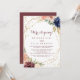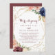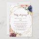 Esta tarjeta de recepción geométrica y rústica de purpurina dorado es perfecta para un moderno fiesta postelectoral. El diseño se compone de acuarela de color púrpura, marina, rubor, burdeos, flores de la marina, hojas verdes y doradas purpurina y un marco geométrico elegante. Las tarjetas RSVP se venden por separado.