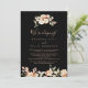 Esta tarjeta de recepción floral floral de color negro es perfecta para un moderno fiesta poselectoral. El diseño se compone de flores acuáticas elegantes, rosas y blancas con hojas de color verde esmeralda.