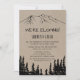 Esta invitación de recepción de elopement rústico y boscoso de montaña es perfecta para una fiesta post elopement en el bosque. El diseño inspirado en la naturaleza presenta la silueta de un bosque de pinos y montañas en papel kraft falso. Las tarjetas de RSVP se venden por separado.