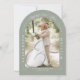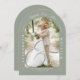 Este elegante arco fotográfico verde sabio con invitación a la boda de escritura caligráfica se puede personalizar con su información en tipografía moderna. Diseñado por Thisisnotme©