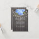 Tarjetas de recepción de madera de granero con hortensias azules y luces de cuerda.