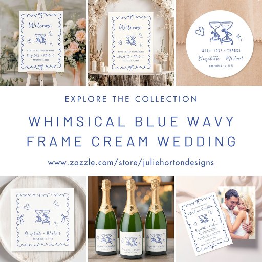 Invitación a una boda de inspiración retro y extravagante con un marco ondulado azul francés adornado con arcos de coqueta, ilustraciones caprichosos de corazón dibujados a mano, estrellas y copas de vino, y "Recepción de boda" y los nombres de la novia y el novio en un divertido y lúdico guión azul.