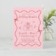 Invitación a una boda rosa y roja de inspiración retro, con un marco ondulado adornado con arcos de coqueta y ilustraciones de corazones, estrellas dibujados a mano y una elegante mesa boda romántica. "Recepción de bodas" y los nombres de la novia y del novio se muestran en un libreto de escritura roja.