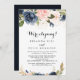 Esta tarjeta de recepción floral de caligrafía floral de invierno es perfecta para un fiesta poselupement moderno. El diseño se compone de bonitos azules oscuros pintados a mano, azules, marinos, rosados, ondulados, flores doradas y follaje verde, repartidos en elegantes ramos. Las tarjetas RSVP se venden por separado.