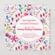 Una pintura acuarela de flores y hojas con colores vivos diseminados en un fondo blanco. Una magnífica invitación a la celebración de bodas por la noche. Arte original de Nic Squirrell.