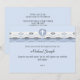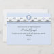 Reúne a todos sus seres queridos para esta importante ocasión con esta elegante invitación. Los tonos azules y armoniosos, adornados con una cinta de ondas azules y blancas, se suceden en la cima de esta bonita invitación. Una cruz blanca simple en un escudo circular es el punto focal. Igualmente adecuado para un bautismo, bautizo o primera comunión sagrada.
