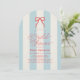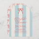 This coquette bridal shower invitation features a red bow on a cream background with light blue stripes. The reverse side features a cream background with a red bow pattern. Personalize it for your needs. You can find matching products at my store.