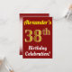 Este diseño de invitación para fiestas de cumpleaños incluye un mensaje como "¡La celebración de cumpleaños número 38 de Alexander!", donde el nombre puede ser personalizado, y donde el número "38" tiene una apariencia falsa de oro. También tiene un fondo de color rojo. Los detalles del evento en la parte posterior se pueden personalizar. Se podría usar para invitar a la gente a la celebración de 38 años o fiesta de cumpleaños de alguien. [~Z0000120]