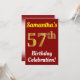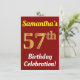 Este diseño de invitación para fiestas de cumpleaños incluye un mensaje como "¡Celebración de cumpleaños número 57 de Samantha!", donde el nombre puede ser personalizado, y donde el número "57" tiene una falsa apariencia dorada. También tiene un fondo de color rojo. Los detalles del evento en la parte posterior se pueden personalizar. Se podría usar para invitar a la gente a la celebración de 57 años o fiesta de cumpleaños de alguien. [~Z0000120]