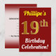 Este diseño de invitación para fiestas de cumpleaños muestra un mensaje como "¡La celebración de cumpleaños número 19 de Phillipe!", donde el nombre se puede personalizar, y donde el número "19" tiene una apariencia falsa de oro. También tiene un fondo de color rojo. Los detalles del evento en la parte posterior se pueden personalizar. Se podría usar para invitar a la gente a la celebración del 19º cumpleaños o a la fiesta de cumpleaños de alguien. [~Z0000120]