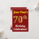 Este diseño de invitación para fiestas de cumpleaños incluye un mensaje como "¡La celebración de cumpleaños número 70 de Jean-Paul!", donde el nombre puede ser personalizado, y donde el número "70" tiene una falsa apariencia dorada. También tiene un fondo de color rojo. Los detalles del evento en la parte posterior se pueden personalizar. Se podría usar para invitar a la gente a la celebración de cumpleaños número setenta de alguien o a la fiesta de cumpleaños. [~Z0000120]