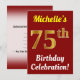 Este diseño de invitación para fiestas de cumpleaños incluye un mensaje como "¡La celebración de los 75 cumpleaños de Michelle!", donde el nombre puede ser personalizado, y donde el número "75" tiene una apariencia falsa de oro. También presenta un fondo de color rojo. Los detalles del evento en la parte posterior se pueden personalizar. Podría ser usado para invitar a la gente a la celebración de 75 años o fiesta de cumpleaños de alguien. [~Z0000120]