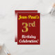 Este diseño de invitación para fiestas de cumpleaños incluye un mensaje como "¡La tercera celebración de cumpleaños de Jean-Paul!", donde el nombre se puede personalizar, y donde el número "3er" tiene una falsa apariencia de oro. También tiene un fondo de color rojo. Los detalles del evento en la parte posterior se pueden personalizar. Se podría usar para invitar a la gente a la celebración de cumpleaños o cumpleaños de alguien. [~Z0000120]