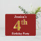 Este diseño de invitación incluye el número ordinal "4th" con un aspecto falso de oro. También cuenta con un nombre personalizado y un fondo rojo. Los detalles del evento en la parte posterior se pueden personalizar. Se podría usar para invitar a la gente a la fiesta de cuarto cumpleaños de alguien. [~Z0000012]