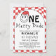Invitación de cumpleaños 1 Navidades de Red One Happy Dude - Un tío dulce - Celebra el grande de tu pequeño de una manera festiva y divertida esta temporada de vacaciones de Navidades con esta linda cara retro de cartón rojo y blanco vestido con una invitación de Fiesta de cumpleaños 1 de Santa hat. Con tablero de ajedrez rojo y blanco ondulado, colores clásicos de la época navideña. Una cara sonriente con un sombrero Santa con los ojos encendidos a mano se añade al divertido tema de la temporada festiva retro. Personalizar esta plantilla editable de invitación para fiestas de primer cumpleaños para chicos con sus propios detalles de evento. Disponible como descarga digital, enviarla fácilmente por correo electrónico, texto o medios sociales.