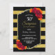Invitación a la cena de 50 años con elegantes exposiciones de flores rojas y naranjas a rayas negras y doradas. El texto es totalmente personalizable para permitirle incluir toda su información para la celebración de su cumpleaños. (Nota: Este purpurina falso ha aparecido en esta invitación.)