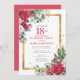 Hermosos rosas rojos y blancos están enclavados en hojas de holly y eucalipto para crear una elegante pantalla floral. Están decorados con un amplio marco dorado y adornados con polvo de confeti dorado. fiesta sorpresa de 18 años y el nombre de la persona está escrito en un gran texto rojo. Todo el texto se puede editar. La elección perfecta para una celebración especial de cumpleaños de invierno.