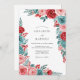 A vibrant display of watercolor artistry featuring bold red roses, soft blush peonies, and deep teal petals. Rich emerald greenery and small berries accent the composition to create a lush, botanical aesthetic. The palette blends warm and cool tones, making it ideal for a romantic spring or summer event.