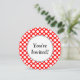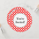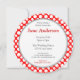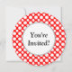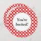Una plantilla de invitación a una personalizado de novias o a una ducha de bebé con simples puntos blancos de polka grandes y pequeños sobre un fondo rojo en una invitación redonda. Haga clic en Personalizar para cambiar las fuentes, los colores de fondo y mucho más, incluso guarde el diseño para más adelante.