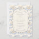 Un dulce diseño inspirado en época pasada que presenta delicados lazos azules, detalles de rayas suaves y encantadoras ilustraciones de jardín de arándanos. Arte estilo Toile con adorables animales y cestas de frutas crea un ambiente clásico de libro de cuentos en una paleta de azul suave en polvo. El marco central ornamentado añade elegancia mientras mantiene el aspecto general ligero, refinado y atemporal. Perfecto para un baby shower con un suave tema de jardín y un toque de encanto tradicional.