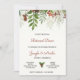 "Rehearsal dinner invitation with floral design. The front features elegant green and red leaves at the top, with event details in script fonts. The back is plain."