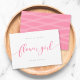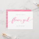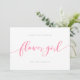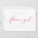 Tarjeta "Stylish Will You Be My Flower Girl" que presenta la palabra "flower" en una escritura cursiva relajada en rosa sobre un fondo blanco. La tarjeta tiene un reverso rosa con líneas blancas superpuestas.