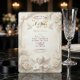 Anuncia tu unión sagrada con la grandiosidad atemporal del Renacimiento. Este diseño presenta estética celestial y flores lujuriantes para un tono verdaderamente romántico. Una composición visual intrincada inspirada en la arquitectura clásica europea. El diseño muestra un efecto de relieve escultórico falso, simulando la apariencia de piedra tallada y molduras arquitectónicas en tonos suaves de champán y beige. Un viñedo central presenta una delicada ilustración de un querubín tocando un violín, acompañado de palomas blancas en vuelo y racimos lujuriantes de rosas crema y rosadas. El fondo imita una superficie de mármol texturizado, mientras que la tipografía simula el brillo de la hoja de oro. Esta es una imagen impresa plana con un efecto de piedra y oro falso, no material realzado, relieve o lámina metálica real.