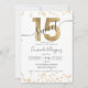 Moderna, moda y elegante Relieve metalizado purpurina de moda de Quinceañera, invitación a la fiesta de cumpleaños con una moderna tipografía dulce de 15 años con purpurina de chispas doradas sobre un fondo blanco editable. Añade tu foto al fondo. Perfecto para el tema princesa mis membrillos, dulce quince!