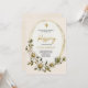 Religious invitation card with floral design. Features a gold cross and circle framing text about a blessing event. White flowers and green leaves accent the elegant off-white background."